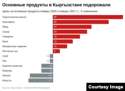 Действительно, цены на говядину в январе 2020 года в сравнении с прошлым годом того же месяца поднялись на 64 сома. Стоимость подсолнечного масла выросла на 45 сомов, сахара - на 10 сомов, яиц - на 20 сомов.